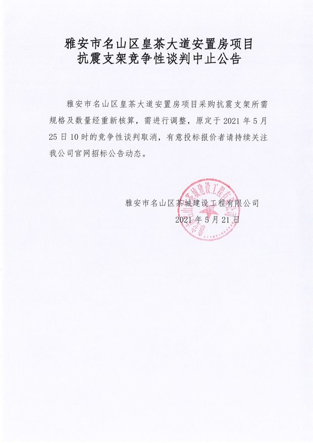 雅安市名山區皇茶大道安置房項目抗震支架競爭性談判中止公告